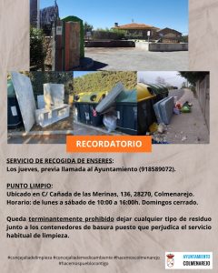 Se recuerda a los vecinos que hay un servicio de RECOGIDA DE ENSERES los jueves, previa llamada al Ayuntamiento para reservar (tlf.: 918589072).